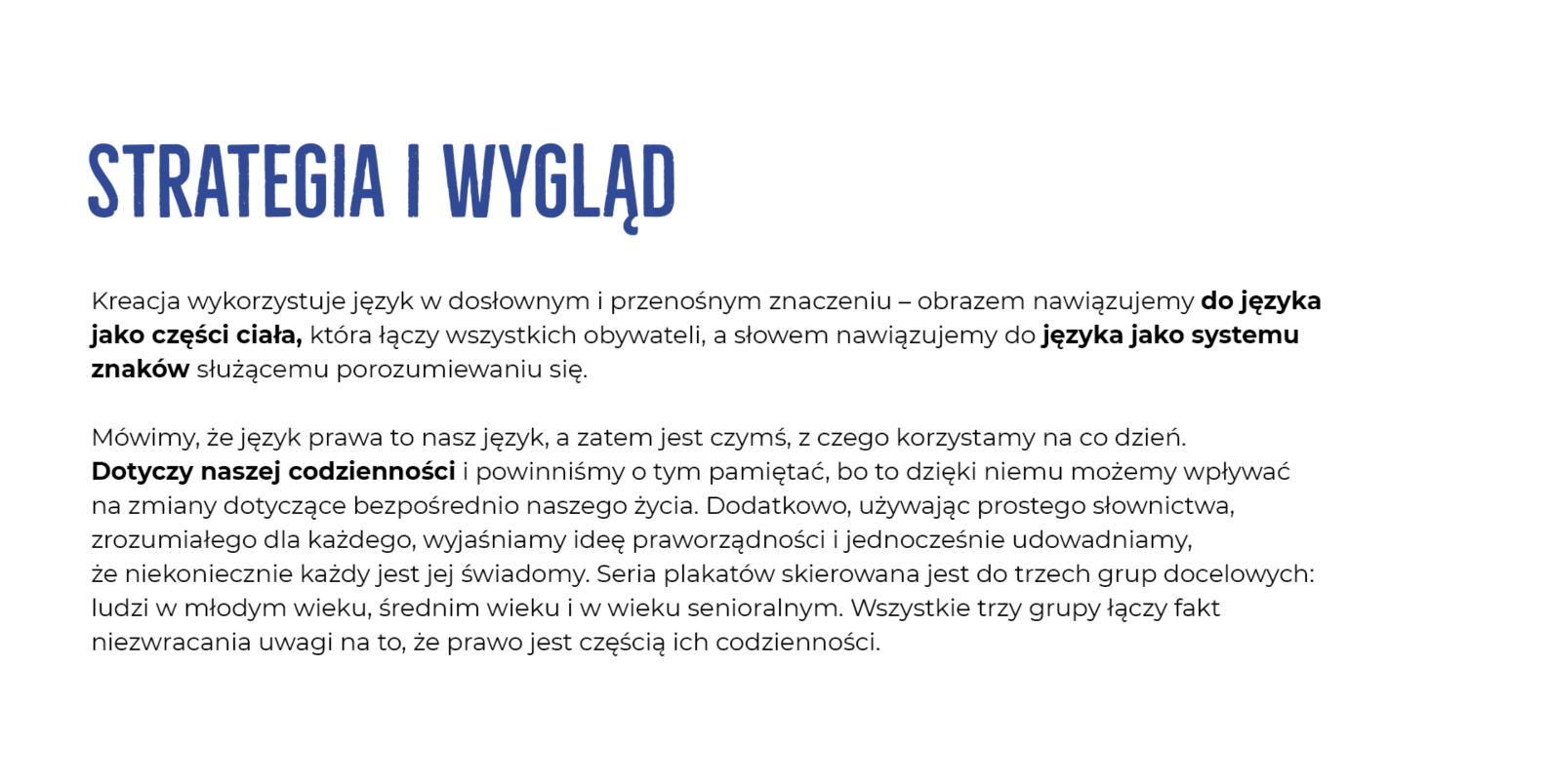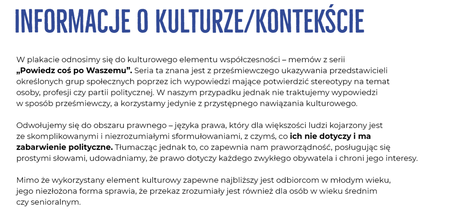 "Po indywidualnym przemyśleniu tematu, a następnie wspólnej burzy mózgów, odnalazłyśmy nurt koncepcyjny, z którym postanowiłyśmy odważnie płynąć do przodu. Dlaczego odważnie? Bo zaprojektowany przez nas plakat na pierwszy rzut oka wcale nie kojarzył się z prawem. Mimo to chęć stworzenia czegoś wyróżniającego popchnęła nas do zestawienia tematu prawa z barwnymi językami i kreatywną grą słów. W projekcie postanowiłyśmy odnieść się również do kulturowego elementu współczesności jakim są memy oraz do prostego języka tłumaczącego przeciętnemu obywatelowi, na czym polega praworządność." - tłumaczy Monika Olkiewicz, współtwórczyni zwycięskiego designu.